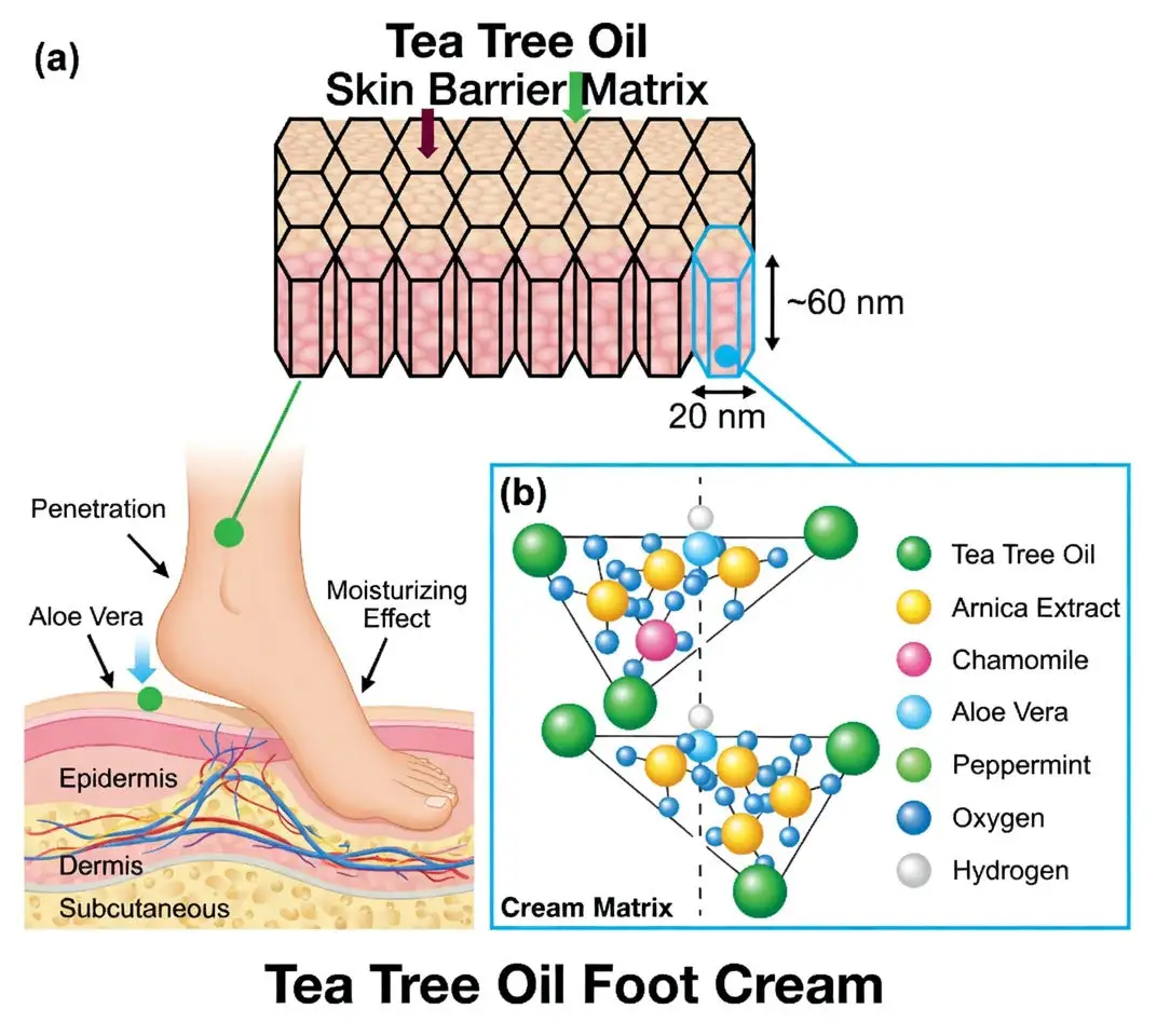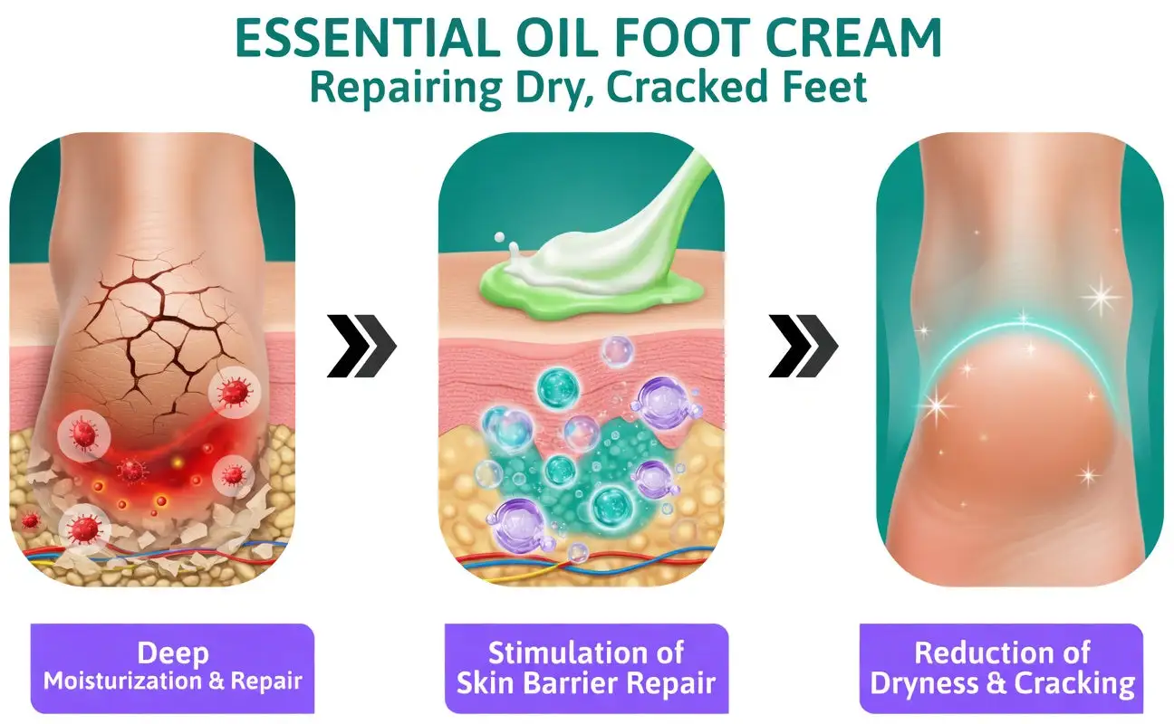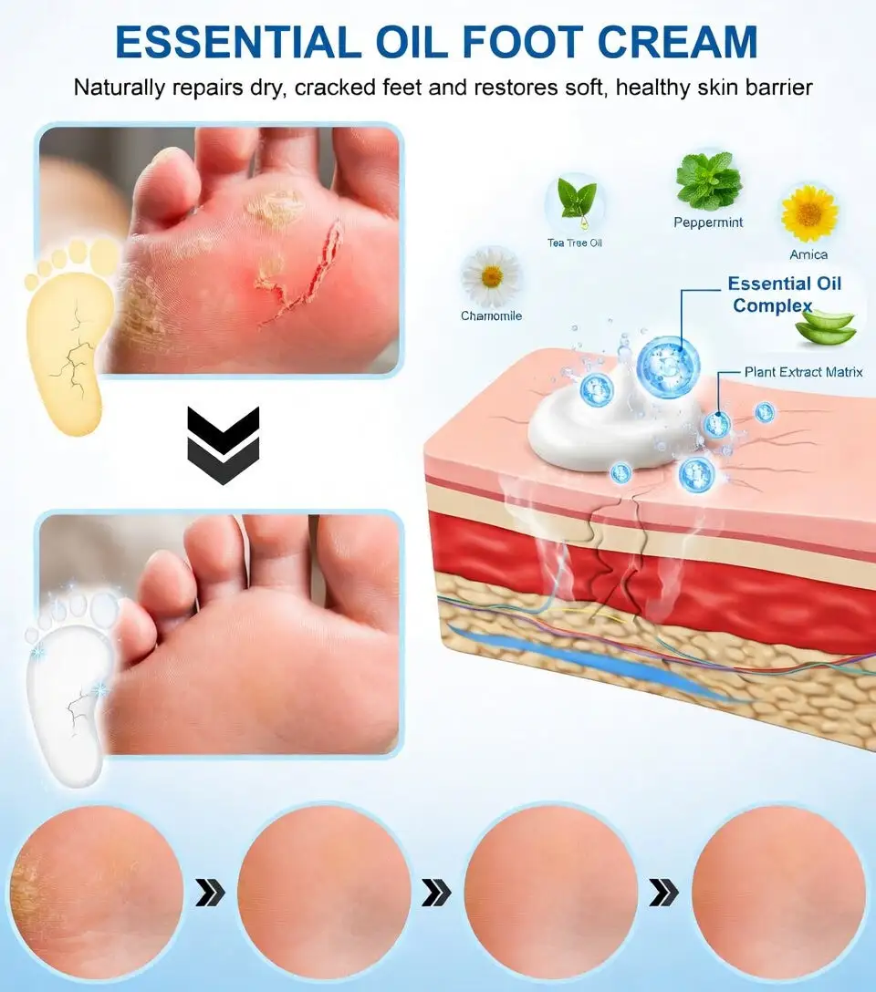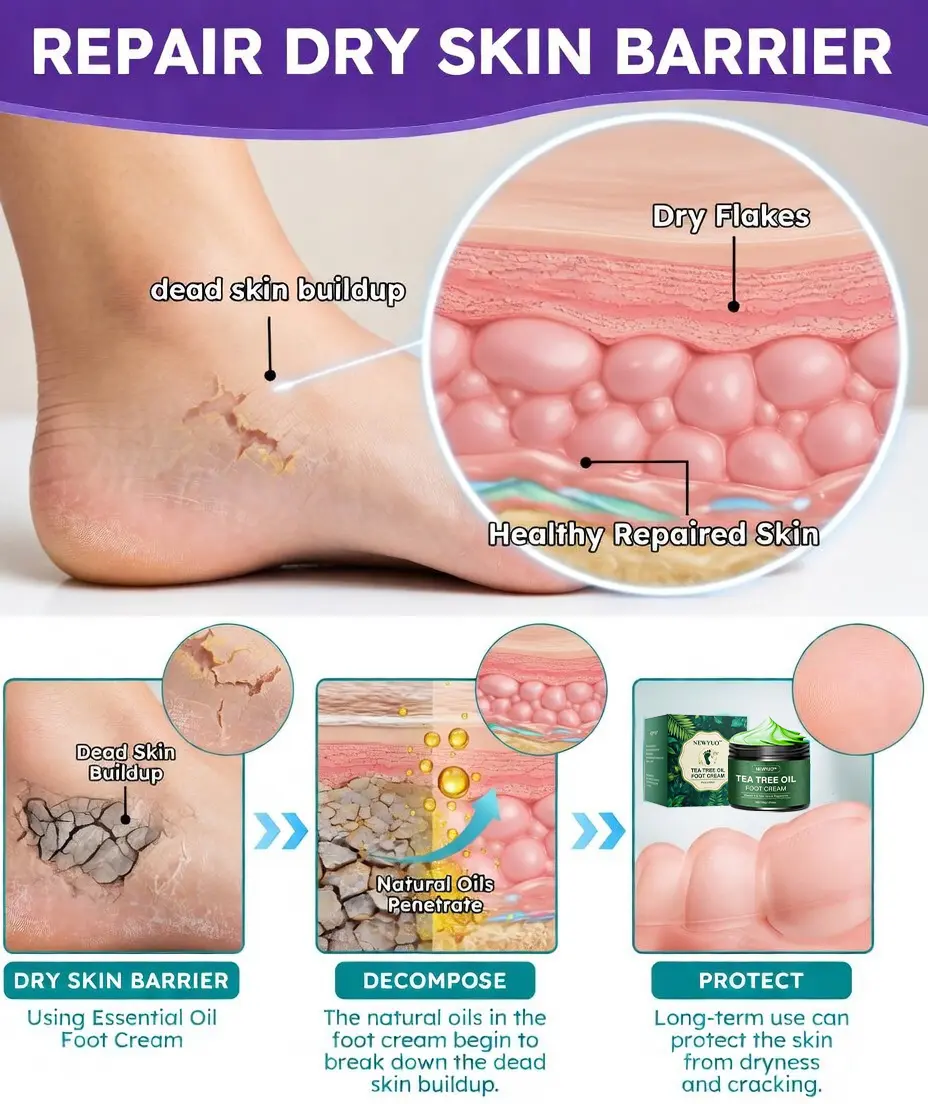 Our advancedĀ tea tree oil formula, combined with natural moisturizing agents and essential oils, penetrates deep into the skin to repair cracked heels at the cellular level. This intensive hydration andĀ repair process restores the skin barrier, halts further cracking, and promotes soft, healthy skin regeneration.
